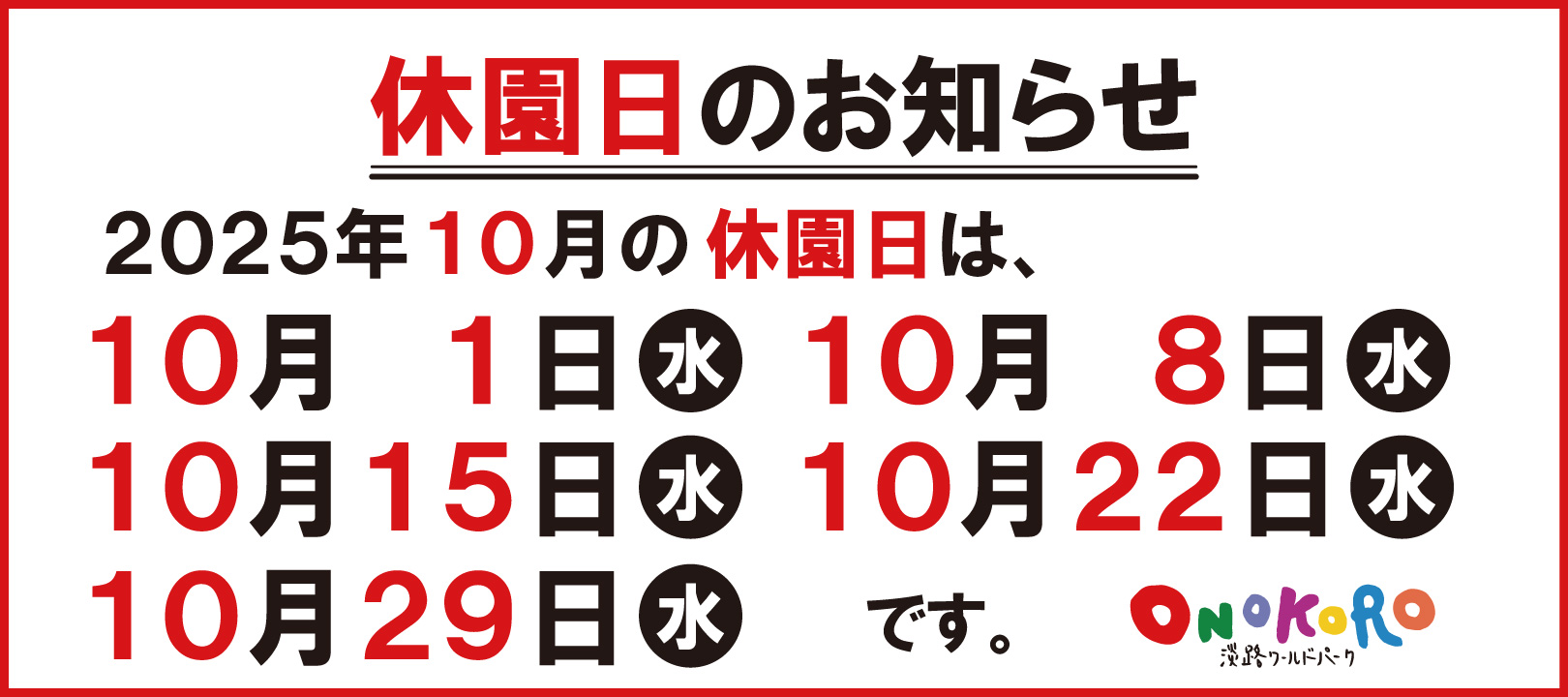 2025年(令和7年) 【10月】休園日のお知らせ