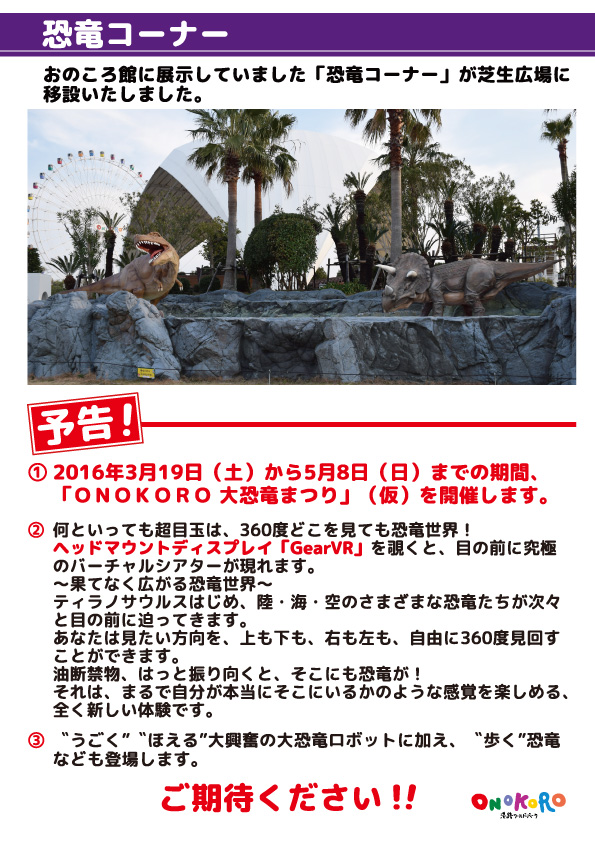 「恐竜コーナー」芝生広場に移設しました。2016年2月7日